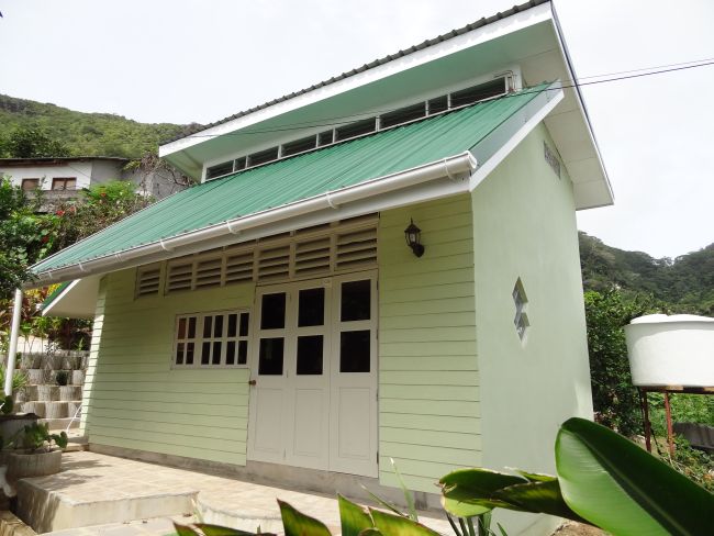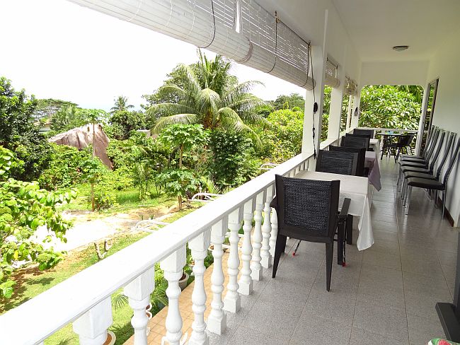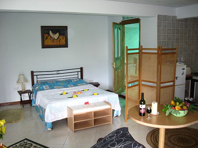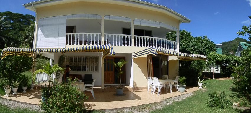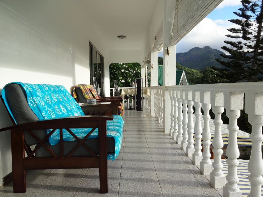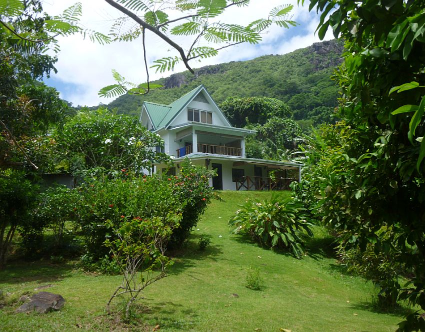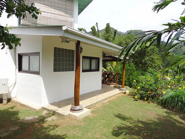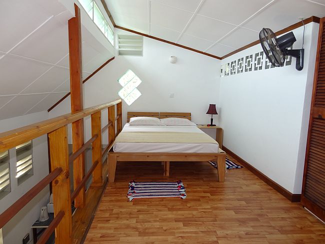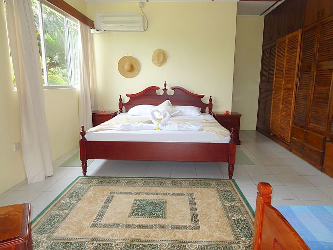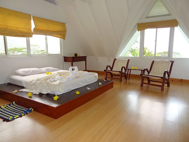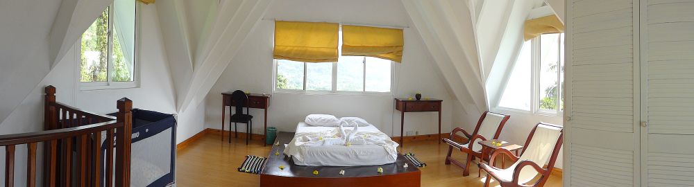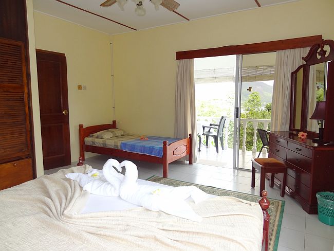 Es gibt ein sehr schönes, geräumiges Zimmer im Obergeschoss, mit eigenem Bad und schönem Blick von der Terrasse zur Beau Vallon Bucht.