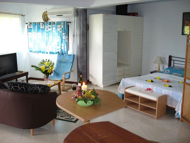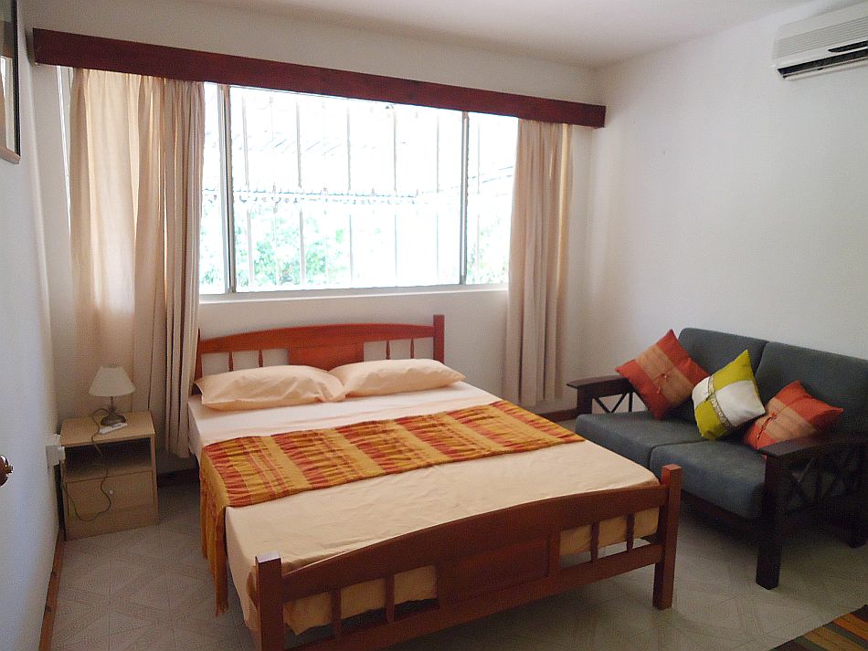 Ausstattung der Jaracanda Apartments: Klimaanlage, Schlafzimmer mit King Size Doppelbett, anschliessendes Badezimmer, Wohnbereich mit TV und ausziehbarem Sofabett, voll ausgestattete Küche und eine Terrasse mit Blick auf Garten, Berge und die Beau Vallon Bucht.