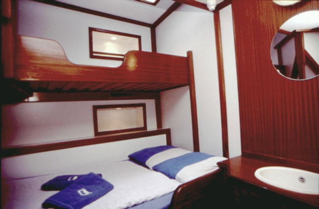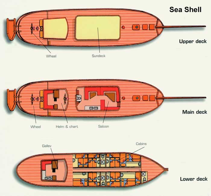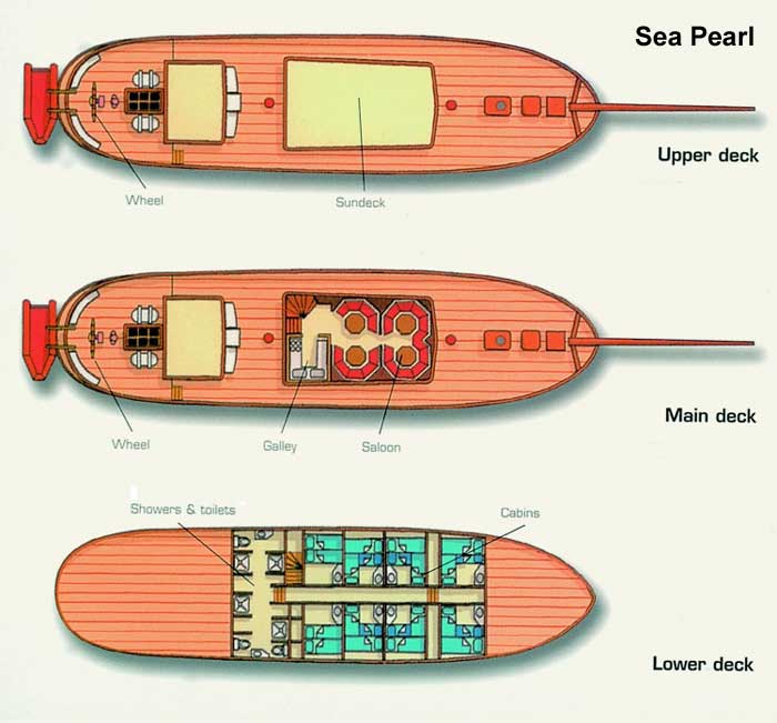 Die Sea Pearl ist wie ihr Schwesterschiff Sea Shell ein historischer Motorsegler aus den 1920er Jahren. Es liegt in der Natur der Sache, dass man - trotz Adaptierung und teilweisen Umbau in den späten 1990er Jahren - Abstriche an Komfort machen muss, im Vergleich zu den neuen und unten auf dieser Seite beschriebenen Sea Bird und Sea Star. Zum Beispiel teilen sich auf der Sea Pearl mehrere Kabinen ein Bad (ein Waschbecken ist aber in jeder Kabine vorhanden), die Klimaanlage lässt sich nur zentral und nicht individuell einstellen, etc. Die Sea Pearl ist daher für unkomplizierte Gäste gedacht, für die die günstigeren Preise ein Thema sind.