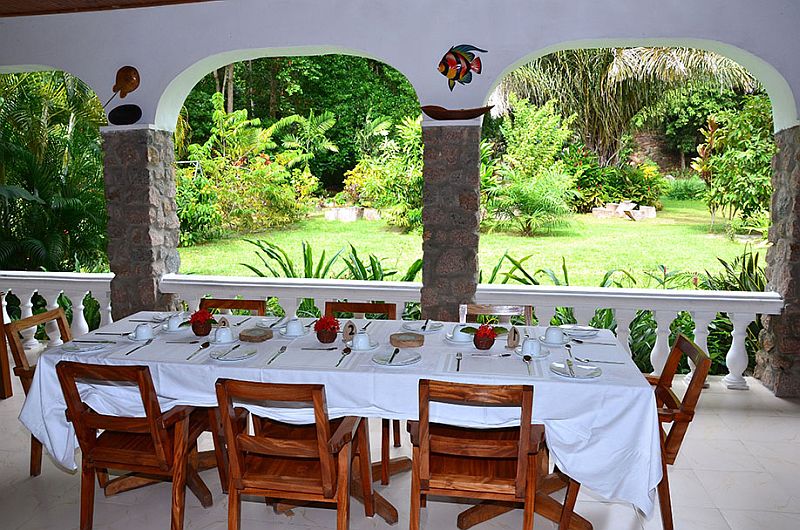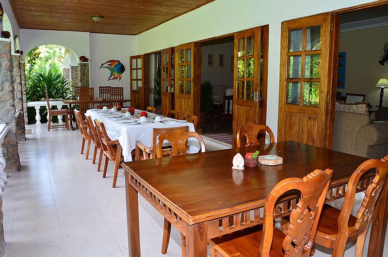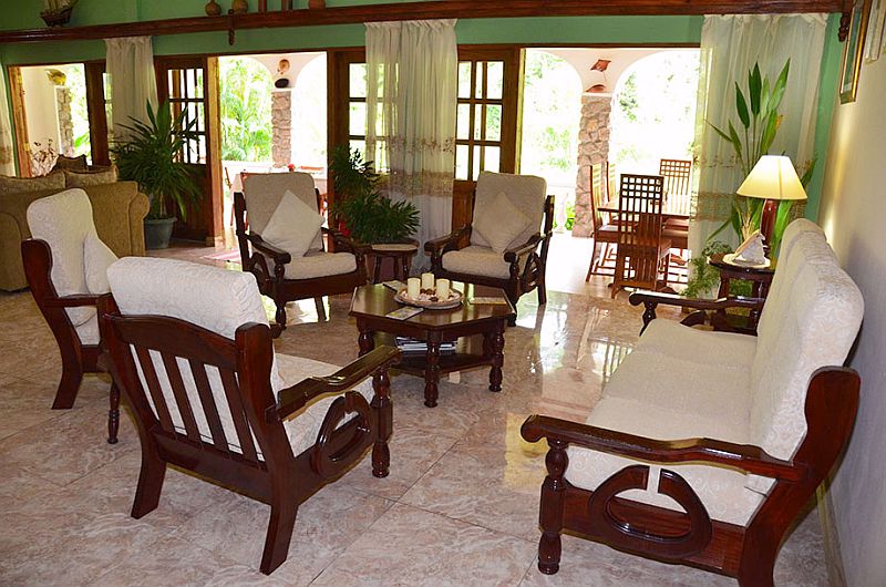 Der gemeinschaftliche Aufenthaltsraum (Lounge) und der Frühstücksraum sind zum Garten hin offen und so können Sie den tropischen Vögeln lauschen während Sie das Frühstück geniessen, lesen oder einfach nur die Seele baumeln lassen.