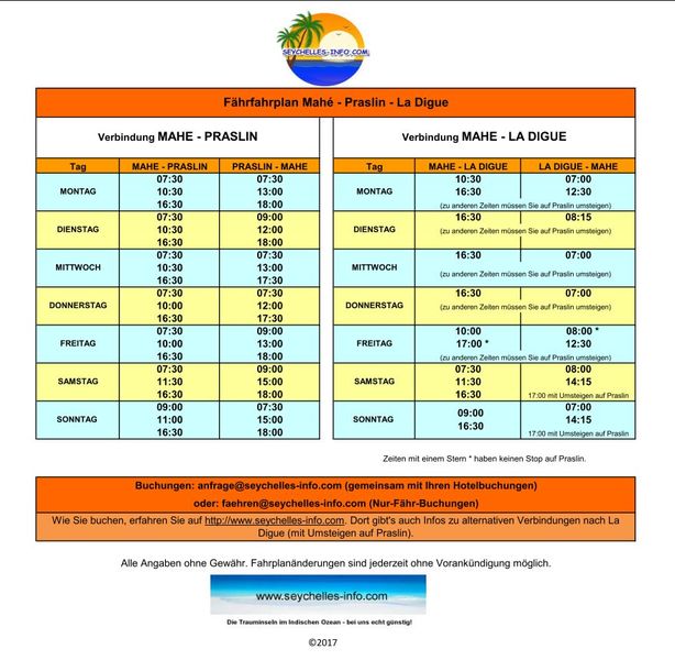Falls Sie hingegen nur die Fähren über uns buchen möchten, verwenden Sie bitte unser ONLINE-BUCHUNGSTOOL. Alternativ schicken Sie uns eine Mail an die folgende Adresse: faehren@seychelles-info.com. Wenn Sie eine Mail schicken, geben Sie uns bitte die gewünschten Abfahrtszeiten laut Fahrplan an und alle Namen, Flugdaten und Geburtsdaten der Kinder an.