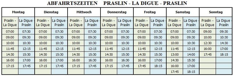 Falls sich die Schnellfähre aus Mahé (s.o.) mal ein paar Minuten verspäten sollte, wartet die La Digue-Fähre i.d.R. auf die Umsteigegäste, sodass man nicht Angst haben muss, den Anschluss nach La Digue zu verpassen.