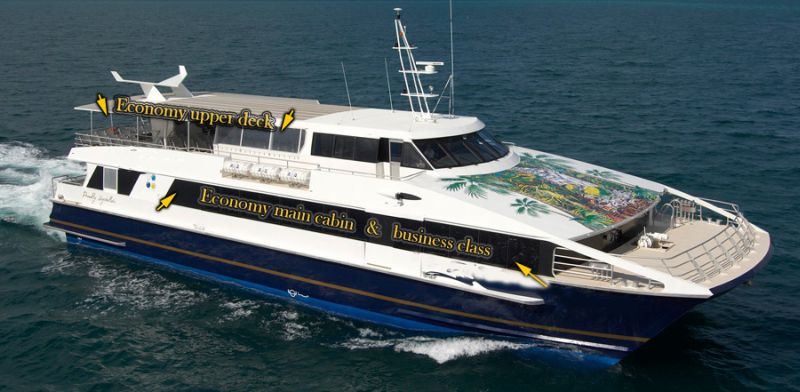 Bitte geben Sie uns bei einer Economy-Buchung an, ob Sie in der Main Cabin (unten, geschlossen, mit Klimaanlage) oder auf dem Oberdeck / Upper Cabin (oben, im Freien) reisen möchten. Der Aufpreis für das Oberdeck beträgt fünf Euro pro Person und Strecke.